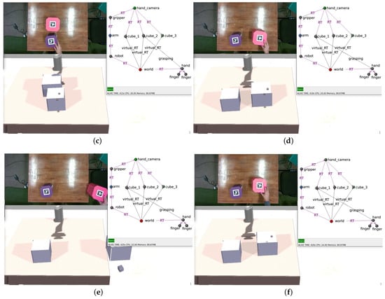 Cups and balls experiment. (a) Shows the initial configuration. When a human hand is detected for the first time, a new node is inserted, and two spheres representing fingertips placed in the simulation (b). Grasp detection can be seen in (c,d) where the WM has a grasping edge from the hand to the box being manipulated. In (e), the box containing the cube is placed over the edge, and the simulator shows the cube falling to the ground. (f) shows the final state of the experiment.