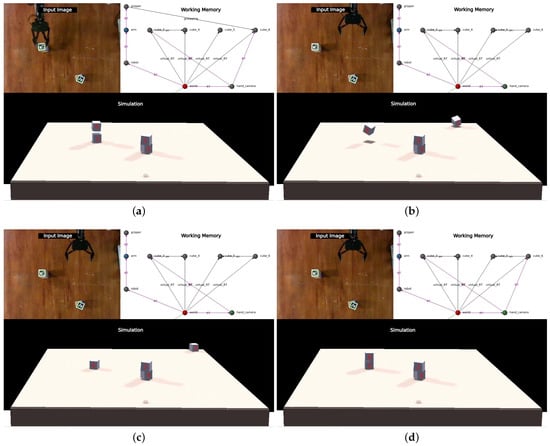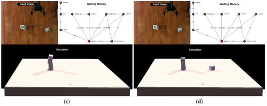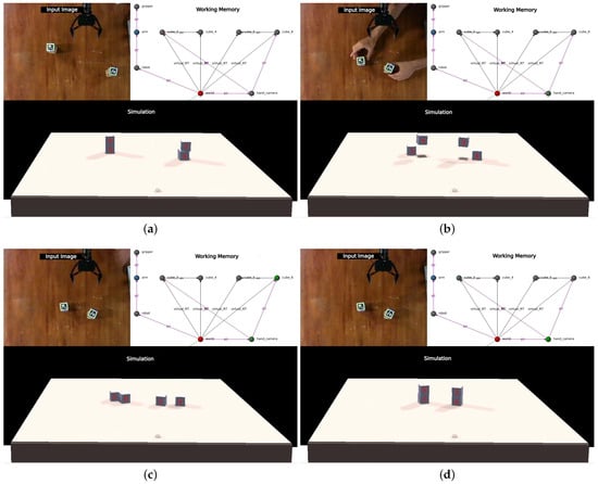 - Full-tower movement: It consists of moving a tower of two cubes and evaluating whether the system is able to recognize this perturbation and use the semantic information of the graph to correct it. Figure 10 shows snapshots of the execution of this perturbation.