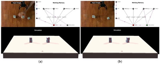 In contrast to the approach taken by Sallami et al. [], where human intervention was detected through a state machine observing object configurations strongly violating the effect of gravity, we leveraged the geometric reasoning within our setup to detect grasping. A novel agent was developed, employing the MediaPipe Hands algorithm [] along with depth information to detect human hands. This agent then placed the finger positions into the working memory. Subsequently, the simulation-handler agent incorporated these fingertips into the simulation as simple spheres. As long as one or more of these spheres were in collision with an object, gravity was not applied to it.
