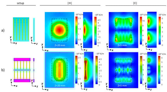 Another property that was analyzed by a set of eigenmode solver simulations is the density of the conducting strips with uniform and non-uniform (convex and concave) distributions. Increasing the density of the strips resulted in an increased |H|/|E| ratio. The convex configuration can be utilized to focus and increase the local H-field peak, while the concave distribution can be utilized to disperse the H-field distribution. Importantly, the strips’ distribution can be employed to control the hot spots of the electric field. It was observed that the convex configuration reached a higher H-field peak, but resulted in higher local E-field hot spots. This outcome is important when investigating the power deposition for a specific application. Depending on the application, convex or concave configurations can be of interest. Note that a non-uniform distribution of both the conducting strips and the dielectric was manually tailored under practical constraints of the setup, with a simple quadratic rule for the strips’ distances. Therefore, further studies to generalize and further improve the distribution should be performed.