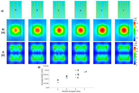 Different distributions of conducting strips. (a) Structure schematics. (b) |H| field map parallel to the structure plane located 20 mm from the structure’s center. (c) |E| field map at 5 mm from the structure. (d) Averaged |H|/E| ratio as a function of the different distributions. The A, B, D, and F configurations represent 4, 5, 6, and 7 uniformly distributed strips, respectively. The C and E configurations are of a convex and concave distribution of six strips, respectively. The black-dashed overlay shows the structure’s dimensions, and the red-dashed overlay shows the region of the averaged |H| and E| used to calculate the |H|/E| ratio.