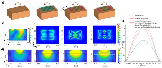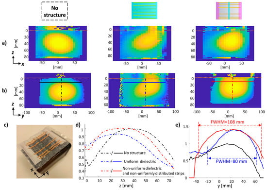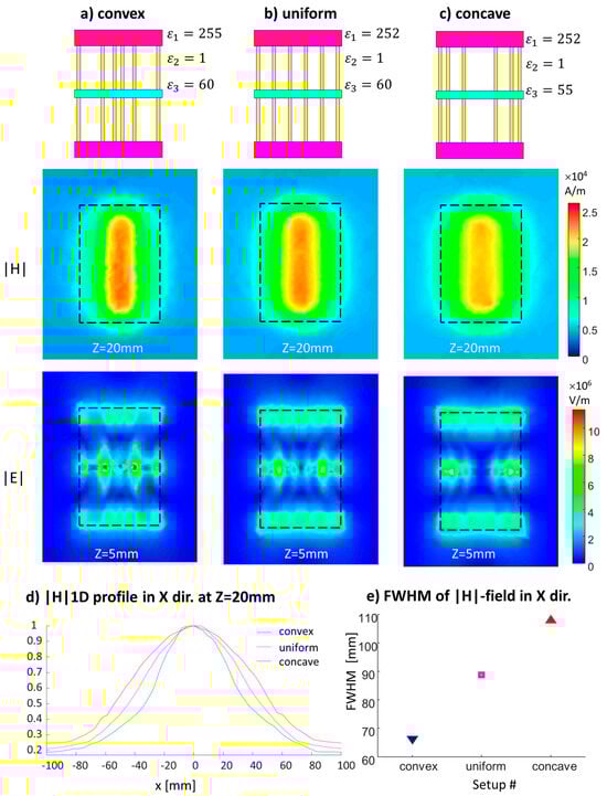 Figure 3 shows the convex, uniform, and concave configurations of the strips with a non-uniformly distributed dielectric. While the maximum of the H-field distribution is higher for the convex case, the concave configuration can produce wider coverage (Figure 3d shows a 1D normalized profile at the center). Figure 3e shows the estimated full-width-half-maximum (FWHM) in the X direction for the three setups. The concave vs. uniform configuration showed an increase of 22% in the FWHM in the X direction. An additional significant outcome is that the local hot spot peaks observed in the E-field are smaller in the concave configuration.