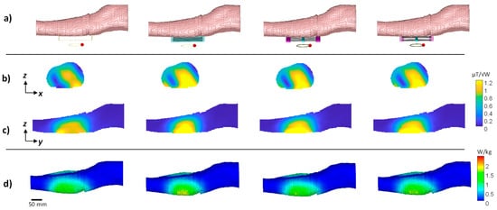 3D EM simulation in a calf region of interest. (a) The setup. (b,c) The B1 map in XZ and YZ planes. (d) 3D view of the SAR map.