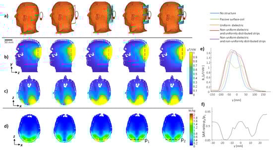 The simulation in the brain as a region of interest, with a structure added at the back of the head, compared three metamaterial-like structures and a passive surface-coil (Figure 6). Compared to the passive surface-coil, the B1 peak increased 1.99-, 1.99-, and 2.13-fold in the uniform dielectric, non-uniform dielectric, and combined non-uniform dielectric and conducting strips. The SAR deviated from the passive surface-coil by 9%, 1%, and −6%, while the transmit efficiency increased 1.9-, 1.98-, and 2.20-fold, respectively. The maximal SAR was reduced by 8% by the non-uniform copper strips’ distribution (compared to the uniform strips’ distribution). All SAR values are summarized in Table 1. Figure 6 shows a 1D plot of the local SAR that reaches a reduction of 15%. In another set of simulations, which involved an addition of the metamaterial-like structure near the left ear, the SAR reduction using the non-uniform conducting strips’ distribution (compared to uniform) was even more significant—a 14% reduction of the SAR (see Supplementary Material Figure S2 and Table 1).