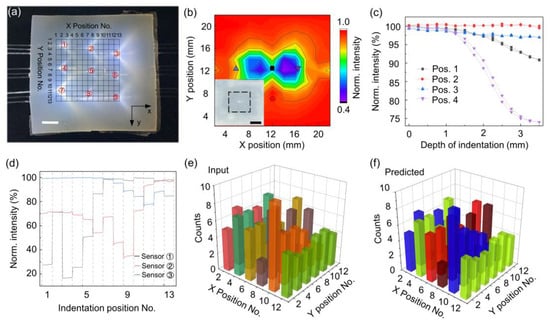 The spatially resolved touch sensing has vibrant applications in human–machine interaction and soft robotic systems [1,2,30,31]. To this end, we fabricated a soft touchpad with an embedded sensor array, as shown in Figure 3a. Nine POF sensors were arranged to form a sensing area of 24 mm × 24 mm (black dash grid). The designed effective sensing area is based on the spatial indentation response of a single sensor, as shown in Figure 3b. Note that we fabricate a square elastomer embedded with a single sensor, as shown in Figure 3b inset. To obtain the spatial response map, we use a cylindrical rod with a diameter of ~ 2 mm as a probe to load on the elastomer and collect the output light signal simultaneously. The step distance of each measurement is set as 2 mm. We also measured the indentation response at four typical positions (Figure 3c). Generally, the POF sensor can only respond to an indentation depth larger than ~1.2 mm, which agrees with the buried depth of the sensors. In addition, the anisotropic indentation response is clearly observed, that is, the pressing along the axial direction shows a higher sensitivity than that of the orthogonal direction. Intuitively, the sensitive region distributes around the two POF endfaces. For 2D pressing recognition, a 13 × 13 grid is established with 2 mm spacing, and pressing is applied at each grid intersection, i.e., 169 detection points. Figure 3d shows that the first-row sensors (sensors ①–③) respond to the sequential indentation, i.e., X position No. = 1–13, Y position No. = 1. Since a single POF sensor has a certain detection area, there is a correlated response in the indentation motion. By harnessing the intrinsic correlations of neighboring sensors, it should be possible to realize distributed sensing with a small number of detection units. Here, as a proof-of-concept demonstration, we test the recognition of 169 (13 × 13) positions using a 3 × 3 sensors array, as indicated in Figure 3a. We collected 50 output fiber images per indentation position, and the Random Forest algorithm was used to process the datasets [32]. Figure 3e shows the 179 randomly selected sensing data from different press locations as inputs, with the counts indicating the number of sensing data at a certain position. Figure 3f shows the predicted results of the pressing positions and their counts. The predicted results agree well with the inputs, and thus the proposed intelligent sensing system can well recognize the 2D indentation position, and the prediction accuracy is ~99.17%.