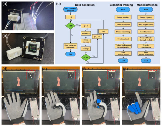 Intelligent hand gesture recognition with an integrated detection system. (a,b) Images of an integrated data acquisition system. The POF arrays are adapted into a printed block, which is then attached to a commercial image sensor. (c) Flow chart of real-time gesture recognition algorithms. The algorithms mainly contain three parts: data collection, classifier training, and model inference. (d–g) Demonstration of the real-time detection of hand gestures via the optical sensing system. The red-dashed box indicates the real-time output light field of POF sensors.