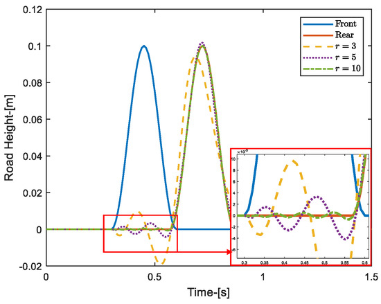 Here, we take a collision excitation signal as an example, assuming that the actual input to the front wheel is known, as shown in Figure 2. By comparing the approximate effect of the rear-wheel input with different values of m, it can be seen that the larger the m, the closer to the real situation.