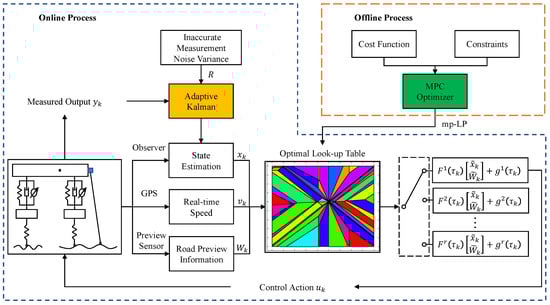 In this section, we consider the changes in the parameters of the model matrix due to changes in vehicle speed based on the augmented model after the Padé approximation. We will address this issue within the LPV framework. For this purpose, Figure 3 shows the general architecture of the MPC-LPV proposed in this paper. The proposed MPC-LPV consists of two phases, an offline phase and an online phase. The output of the offline phase is a lookup table for the optimal control output; i.e., a cost function containing the future prediction domain and the control domain is designed in the feasible domain of the scheduling parameters, and the optimization problem is solved offline using the mp-LP method. In the online phase, an adaptive Kalman estimator based on a sequence of residuals is first designed to estimate the full state of the system by adjusting the imprecise measurement noise variance, and finally, the optimal control output is calculated by searching the lookup table based on the available input information, such as the current system state, the road ahead, and the vehicle speed.