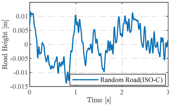 In this section, we establish ISO level C random road surface input based on Equation (14) and to observe the suspension response at different vehicle speeds, aiming to validate the improvement effect of the proposed MPC-LPV method under varying vehicle speeds. The road surface input is illustrated in Figure 5, and the improvement effects under different vehicle speed variations are compared. This paper introduces MPC-LPV, with its open-loop system employing only passive control (Passive) and a robust control algorithm (Robust).