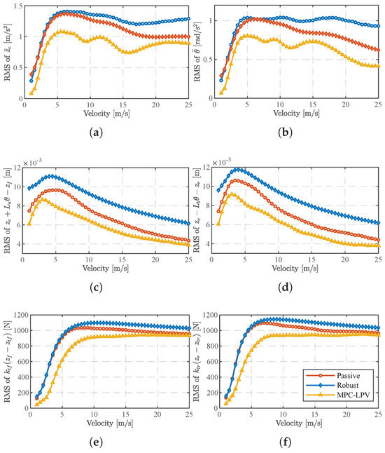 In Figure 6a,b, it is also found that, at low speeds ( 5 m/s), the proposed MPC-LPV does not differ significantly from the open-loop system relying only on passive control in terms of RMS values for , with the main difference between the two concentrated at moderate speeds (5 m/s 25 m/s). In Figure 6c,d, the suspension dynamic travel reaches its maximum at v = 5 m/s, and increasing the vehicle speed improves the suspension response in this category. In Figure 6e,f, the dynamic tire load remains essentially constant when the vehicle speed is greater than 12 m/s. This is because the experimental procedure assumes that the spring-loaded mass is constant and that the dynamic tire load is limited by the constraints of (7) to ensure driving safety, and even if the vehicle speed increases, the damping effect of MPC-LPV, which takes into account the effect of time-varying vehicle speed, does not violate the actual limiting constraint, and the advantage of the other controllers is gradually reduced.