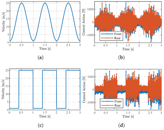 Furthermore, based on a random road surface, we tested the effect of the MPC-LPV controller with two cases with different velocity time steps, as shown in Figure 7. In case one, as shown in Figure 7a, the speed changes continuously and slowly with time steps in the range of 1∼25 m/s, i.e., sinusoidal input. In the second case, as shown in Figure 7c, the velocity varies intermittently, with a maximum value of 25 m/s and a minimum value of 1 m/s, i.e., square-wave input. The control force inputs corresponding to the two different cases of speed variation are shown in Figure 7c,d. It can be clearly seen that the trend of the control force input change is the same as the trend of the speed change, which shows that the MPC-LPV control pair proposed in this paper can provide a timely response to the speed change.