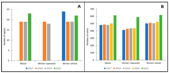 As part of this collaboration, the SSSU provided the IGiK and CBK PAN with comprehensive statistical data pertaining to yields and sowing areas of selected crops for the period of 2017–2021. This valuable dataset was made available in tabular format, offering information at two levels of detail: regions and raions (districts). The statistical data encompassed winter wheat, winter rapeseed, and maize yields, measured in decitonne [dt], reflecting the performance of these crops over the specified five-year period. A database of 7521 records was used in the work. Each record represented the yield of a selected crop in the year 2017–2021 for the district. The database contained data for winter wheat (2656), winter rapeseed (2304), and maize (2561). For each year (2017–2021), there were between 413 and 617 sample records for the crop.