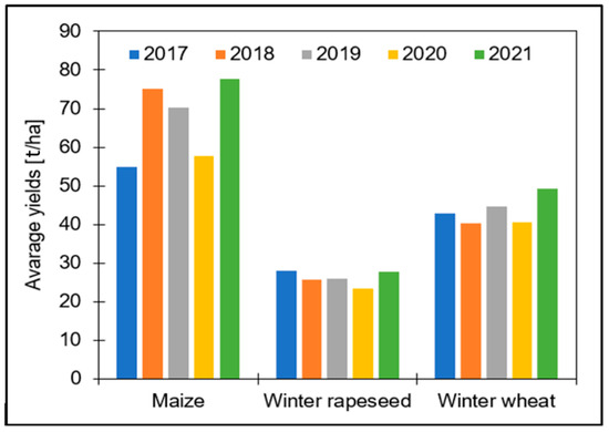 Figure 3, which provides a clear visualization of the annual average yields for the entire country. It is evident from the data that, consistently across all years, maize exhibits the highest average yields among the selected crops. Conversely, winter rapeseed consistently demonstrates the lowest average yields.