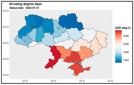 Figure 4 displays the map of growing degree days for winter wheat and winter rapeseed at the end of July, while