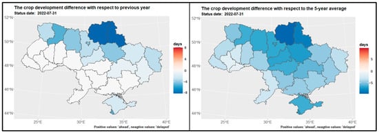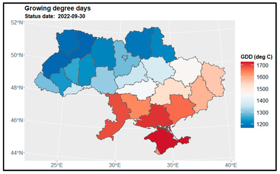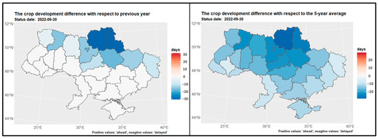 Figure 6 presents the GDD differences for winter crops compared to the previous year, 2021, and the 5-year average across regions. It is observed that the northern regions of the country have a shorter summer growing season, whereas the southern regions experience a longer growing season—GDD is higher. Notably, there are similarities in the duration of the growing season between the preceding year, 2021, and the current year, 2022. However, a discrepancy is evident when comparing with the 5-year average from 2017 to 2021, particularly in the middle and northern regions (