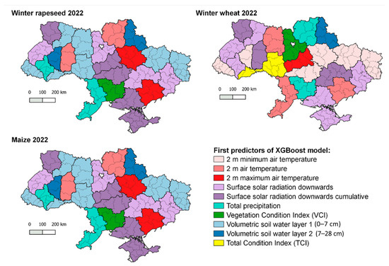 Figure 8 depicts the spatial distribution of the primary predictors selected by the machine learning algorithm for estimating yields of winter wheat, winter rapeseed, and maize in 2022, respectively. Upon examining the maps, it became evident that both agrometeorological and satellite-based indicators played a significant role in the algorithm. However, for winter crops, there is a notable prevalence of agrometeorological predictors, such as 2 m air temperature (maximum and minimum), total precipitation, and surface solar radiation, in numerous regions. Conversely, for maize, the selected predictors primarily focused on volumetric soil water content and surface solar radiation in most regions.