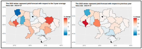 Figure 11). The Ivano-Frankivsk (2) and Vinnytsia (10) regions exhibited the highest yields of winter rapeseed, while the Volyn region (5) was predicted to have the lowest yields. Unfortunately, insufficient data hindered us from determining yield predictions for the Kiev city region (16) and Sevastopol (23). To gain further insights, we compared the yield structure of winter rapeseed in 2022 with the previous year (
