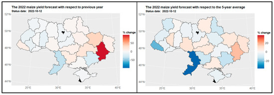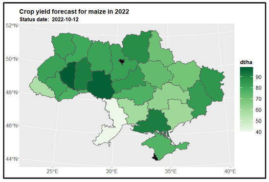 Figure 13). The eastern, western, northern, and southern regions of Ukraine exhibited high maize yields, with the Ternopil (3) and Vinnytsia (10) regions standing out with yields exceeding 90 tons per hectare. Unfortunately, due to inadequate data, yield predictions could not be made for the Kiev city region (15) and Sevastopol (23). When comparing the maize crop structure to the previous year (2021), significant changes in yield patterns were observed in the Donetsk region (25), indicating substantial yield losses (as shown on the left side of