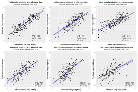 2 = 0.66 in 2019). However, the predictions for winter rapeseed exhibited lower accuracy (R