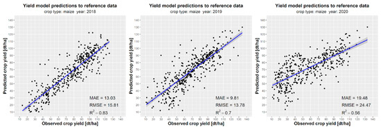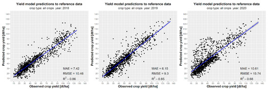 Figure 16 illustrates the variation in forecasting quality metrics across years, particularly the tendency to overestimate crop yields for all three crops in 2020.