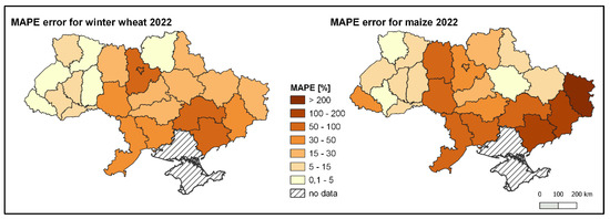 Figure 17) depict the Mean Absolute Percentage Error (MAPE) of the predictions. The choropleth maps illustrate the model’s tendency to exhibit higher predictive errors on the eastern side of Ukraine. Conversely, in the western regions, these errors are noticeably smaller, averaging around 5% for both wheat and maize.