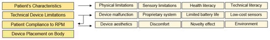 In Figure 2, the RPM Usability Impact Model describes the unique challenges that impact a PGHD device’s usability. The four major pillars of this model are Patient’s Characteristics, Technical Device Limitations, Patient Compliance to RPM, and Device Placement on Body. Each of those will be explained further below.