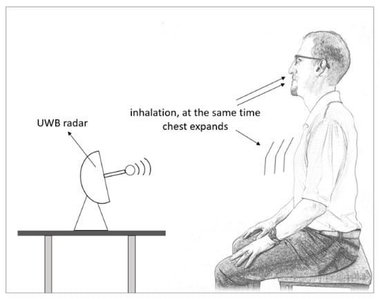 A special type of pulsed radar is Ultra-Wideband (UWB) radar. It has received recent attention due to its ability to physiological signals detection, human target positioning, and wireless communications. It utilizes a wide radar spectrum, as the name suggests, and has more penetrating capabilities through obstacles, providing excellent range due to the short pulse duration, leading to high precision in target detection []. Therefore, it is suited well for determining vital signs and estimating a human’s respiratory rate by determining the displacement of a chest and detecting the chest expansion every time a person inhales [] (see Figure 4). In a relaxed subject, a chest displacement while breathing can induce displacements between 4 mm to 12 mm, depending on the person [,].