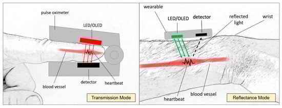 There are two modes of Photoplethysmography that are commonly used—PPG in transmission mode or reflectance mode. Both types utilize a light source to emit light into the tissue; in transmission mode, the light is sent through the tissue to a detector on the opposite side of the light source, while in reflectance mode, the light emitted is reflected, and its intensity is captured by the detector located next to the source []. This PPG mode is commonly used for wearables, predominately measured at the wrist, and PPG in transmission mode is commonly used by pulse oximeters when placed on a person’s finger []. As a light source, green light has been the preferred choice for wearables in reflectance mode due to its lower wavelength, avoiding interference with the blood vessels. For pulse oximeters in transmission mode, red has been the color of choice due to its penetration depth []—see Figure 5.