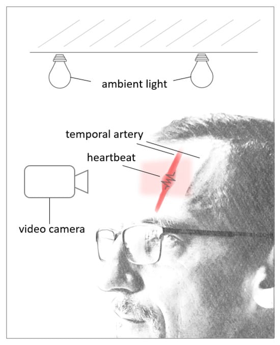 As the Pi-CON methodology promotes determining a patient’s heart rate passively, contactless, and continuously, PPG needs to achieve a heart rate reading from a distance. While PPG can be achieved via transmissive or reflectance PPG with a source emitting light onto a target and the detected difference in light intensity, remote PPG, or rPPG in short, uses a derivative of the reflectance mode by pointing a video RGB (Red, Green, Blue) camera to a target to record the difference of pixel density between heartbeats, with ambient light providing the light source [].