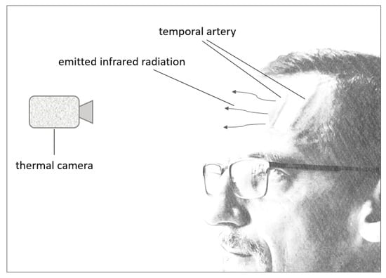 Detecting a person’s forehead temperature can be accomplished without touching a person by using a thermal camera, as it detects thermal radiation from the surface of an object []. Thermal imaging is a safe and noninvasive technology to detect differences in temperatures of objects in the line of sight [], for which an infrared detector is added to a camera. This detector is used to make the light visible that is emitted by warm objects [], which a human’s eye cannot detect.