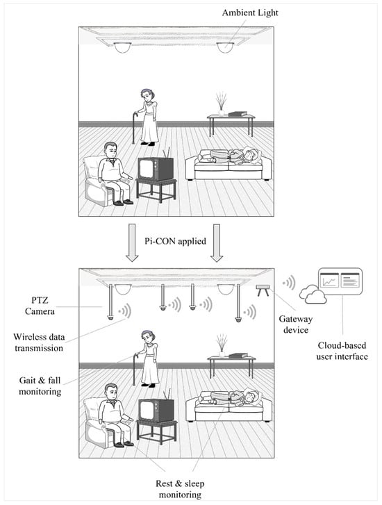 When considering the importance of continuous and at-home health monitoring, including its challenges, novel technologies that are equally usable and minimally invasive must be researched and integrated. To solve these issues, we propose utilizing the Pi-CON methodology. Pi-CON stands for Passive, Continuous and Non-contact and describes a data collection method that eliminates the potential of human error by keeping the cost of human interaction to a minimum and integrates continuous data generation without attaching any devices or sensors to the patient’s body. For this, an omnipresent sensor shall be used to determine a patient’s health condition ubiquitously, avoiding inaccurate patient data acquisition by inexperienced users in an “unregulated” care environment []. This methodology works to prevent the usability issues reported and that patients are experiencing daily when they are asked to put their health in their own hands, taking medical examinations without the presence of a medical professional. To get all benefits of Pi-CON, a fully integrated sensor setup should be cloud-based, or Internet of Things (IoT)-enabled, so that the data captured can be viewed in near-real time in a cloud-based portal that’s accessible from anywhere at any time. Since Pi-CON is proposing to collect data continuously, the real value is achieved when this continuously tracked health data can actually be reviewed as needed to determine a full history and health trends based physical activity and lifestyle.