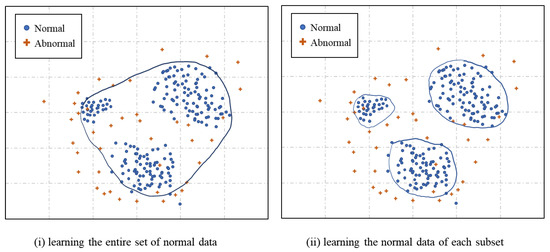 As described earlier, when anomaly detection is used in isolation, it exhibits poor detection rate and high FP rate. An examination of the actual data reveals that the patterns of normal tweets are also highly diverse. If these diverse normal tweets are modeled using one model, the model is trained to be sensitive to normal tweets’ characteristics, increasing the FP rate. Conversely, the spam detection rate decreases if the normal model is smoothed excessively to reduce the FP rate. To circumvent these problems, similar normal data are classified into separate subsets using a DT in this framework. Subsequently, the normal data of each subset are modeled. Normal data are learned by concentrating on each decomposed region and subsequently used for detection, thereby increasing detection performance. This improvement is illustrated in Figure 2, with (i) an illustration of learning the entire normal dataset and using it for detection and (ii) an illustration of learning and modeling the normal data of the subsets of each decomposed region and using them for detection. This framework exhibits high accuracy because it models normal data more precisely.