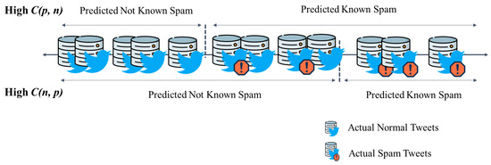In cost-based classification, the misclassification cost is inversely related to the error. Therefore, in this study, when the current tweet spam stream is mostly known spam, is set to be higher than to detect as much known spam as possible in Stage 1. Conversely, when the number of unknown spam is higher than that of known spam, is set to be higher than to detect obvious known spam in Stage 1 and check for ambiguous tweets in the anomaly detection phase during Stage 2. Thus, the proposed method can be adapted to the conditions of the input tweets by adjusting the cost of the pertinent error to be greater than those of other errors. Further, this effect increases with the cost difference, which allows the system to respond to extreme situations. Figure 4 concisely illustrates spam detection using a DT during Stage 1 by adjusting the cost.