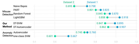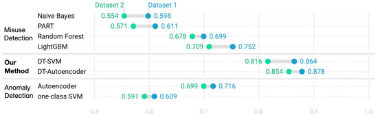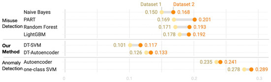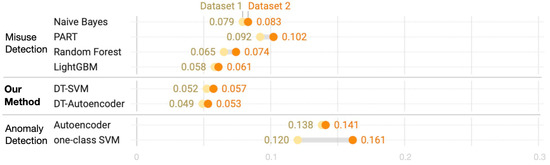 Datasets 1 and 2, as described in the previous section, are used to compare the proposed framework’s performance with those of other methods. Our framework initially utilizes a DT and subsequently employs anomaly detection techniques, such as autoencoders and one-class SVMs. These models are implemented using scikit-learn and keras. CART-based DT is configured with a maximum depth of 10. For the autoencoder, excluding the input layer, four hidden layers are established during the encoding process, with 16, 8, 4, and 2 neurons, respectively. For the decoding process, excluding the output layer, three hidden layers are defined, with 4, 8, and 16 neurons, respectively. The activation function ‘elu’ is employed, along with ‘Adam’ as the optimizer and ‘MSE’ as the loss function. The number of epochs is set to 100. For the one-class SVM, the ‘RBF’ kernel is utilized, and the regularization parameter is set to 0.1.