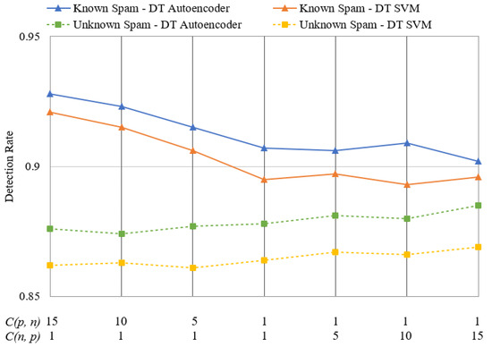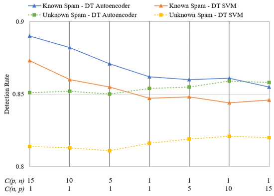 The proposed framework can respond to given situations by adjusting the costs during the DT stage. When the occurrence of existing spam types is high, is set to be high. In contrast, if there are many new types of spam, is set to be high. Figure 9 and Figure 10 depict the change in detection rate for known and unknown spam on Datasets 1 and 2. The left sides of Figure 9 and Figure 10 represent cases when known spam types are more common, and C(p, n) is set to 5, 10, and 15. Here, C(n, p) is set to 1. As C(p, n) is set to be higher, the detection rate for known spam increases as it is harder to miss. The highest detection rate was observed when Dataset 1 was utilized with DT–Autoencoder. Setting C(p, n) to 15 resulted in a detection rate of 92.8% for known spam, which is 2.1% higher than the detection rate of 90.7% achieved by systems that do not adjust the costs. This indicates that increasing C(p, n) can effectively enhance the response to spam in scenarios where known spam is prevalent. In contrast, if C(n, p) is set to 5, 10, and 15 and C(p, n) to 1, the detection rate for unknown spam improves slightly, but not as much as that when C(p, n) is increased. When employing DT–Autoencoder on Dataset 1 with C(n, p) set to 15, the detection rate for unknown spam reaches 88.5%. This is slightly higher than the 87.8% detection rate for unknown spam in systems that do not adjust the costs. This improvement can be attributed to the cost of the DT process—the detection of unknown spam relies on anomaly detection. Our proposed scalable framework is more effective when the threat of existing spam is greater than that of new spam and when the detection of known spam is improved.