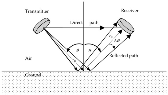 An acoustic transmitter is directed downward at an azimuth angle θ towards a point on the soil surface, which is a distance r0 away, as shown in Figure 1. A corresponding acoustic receiver is placed in the specular reflection direction, also at a radial distance r0 from the target area on the ground. Some sound will travel a shorter direct horizontal path of length r0sinθ from transmitter to receiver, as shown. The receiver subtends an angle 2Δθ at the transmitter.