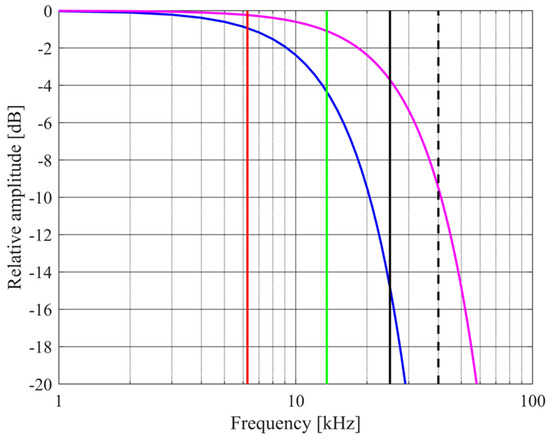 Frequency dependencies: fc with α∞ = 1.35, ϕ = 0.65, and σ = 1 × 105 Pa s m−2 (red line); fV with w = 4 mm (green line); exp(−2/2) with σh = 2 mm and θ = 0° (blue curve); and exp(−g2/2) with σh = 2 mm and θ = 60° (magenta curve). Central frequencies of typical transmitter elements are 25 kHz (solid black line) and 40 kHz (dashed black line).
