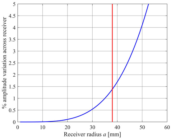 The decrease in amplitude across a receiver of radius a, also given a transmitter of radius a (blue curve) and at the chosen array radius of 38 mm (red line). The transmitted frequency is fT = 25 kHz and the range is 2r0 = 2000 mm.