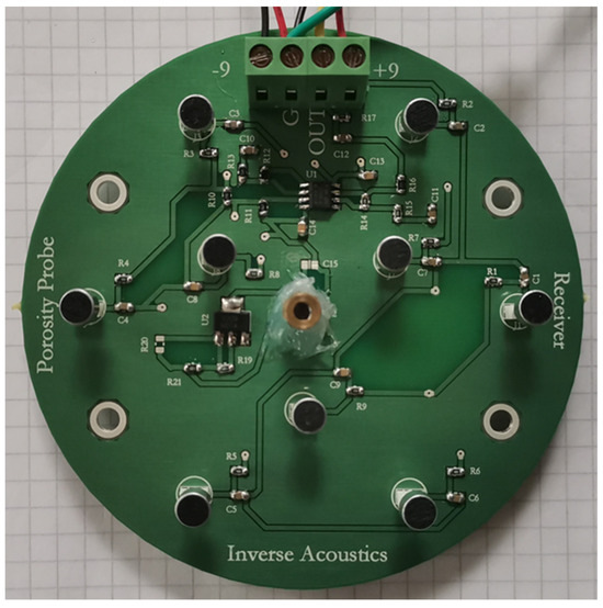 The 250ST/R160 can also be used to receive ultrasound but the need for a transmit/receive switch and the fact that there are more sensitive microphones available led to choosing a WM-61A Omnidirectional Back Electret Condenser Microphone Cartridge https://micronic.co.uk/products/panasonic-wm-61a-omni-directional-mini-electret-condenser-microphone-capsule (accessed on 30 March 2024). The output of this microphone is only specified for frequencies less than 20 kHz (they are intended for audio) but past experience has shown that they work well beyond 50 kHz [19]. Sensitivity is dBm = −35 dB where 0 dB means Vm = 1 Vrms output for an acoustic pressure at the microphone of pm = 1 Pa.