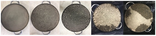 Five soil samples labelled from 1 to 5 were tested in the laboratory. Figure 11 shows the experimental configuration in the laboratory, which was also the configuration used in the field. Two soil samples, labelled 6 and 7, were also tested in situ in the field with the overlying pasture removed. These field samples were then cut out and placed in pans. Both the lab samples and the bare field samples were oven dried (24 h at 105 °C) and weighed. The samples analyzed in the laboratory are shown in Figure 12 (photographs were not taken of the field samples). Note that these samples are less rough than is typical of agricultural soils [23,24].