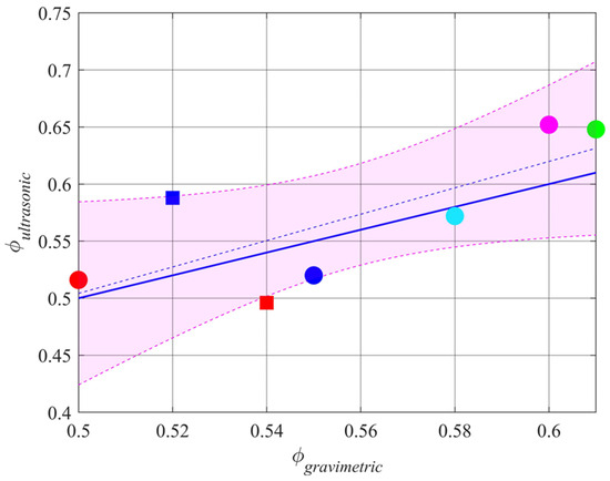 After the acoustic test, the samples were saturated for about 4 days and weighed again. Porosity was determined using the gravimetric method [25] by comparing the saturated weight and oven-dried weight of the samples, giving porosity estimates of ϕgravimetric = 0.55, 0.50, 0.61, 0.60, 0.58, 0.52, and 0.54 for samples 1 to 7 respectively. The porosities estimated from ultrasonic measurements were ϕultrasonic = 0.52, 0.52, 0.65, 0.65, 0.57, 0.59, and 0.50 for samples from 1 to 7, respectively, as shown in Figure 13.