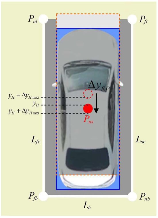 ARP usually requires that there are no obstacles in the parking environment, that the parking garage is known, and that the bottom and side lines of the parking garage, as well as the bottom and top corners of the parking garage, are clearly identifiable. In addition, the constraint on the starting feasibility of parking in the garage should be satisfied: the center point of the starting area should be within the feasible starting area . The angle between the line connecting the center point of the starting area with its bottom midpoint and the bottom line of the garage is called the starting inclination angle . If its absolute value is less than the threshold , the constraint expression of the starting feasibility of reverse parking is as follows :