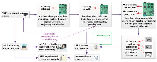 As can be seen from Figure 5, in the ARP process, the ARP driver did not interfere with the normal parking tracking control, and would only activate the experimental vehicle’s stop or emergency brake function if necessary; some of the experimental results were directly obtained from the ARP process environment using an unmanned aerial camera, and some were indirectly obtained using ARP data acquisition sensors and an upper ARP monitoring computer.