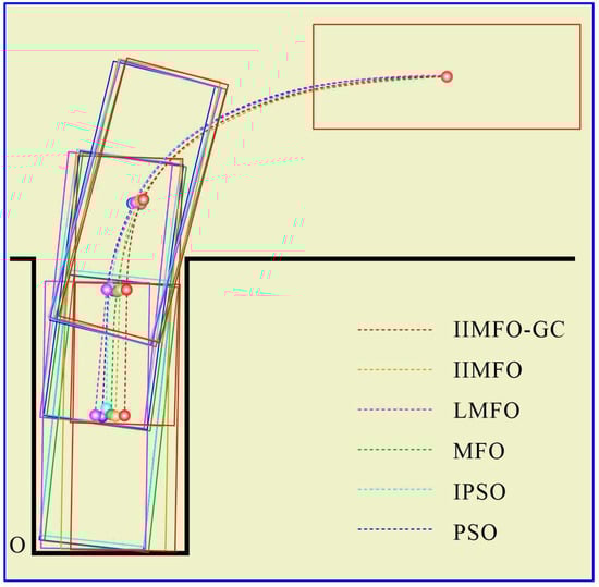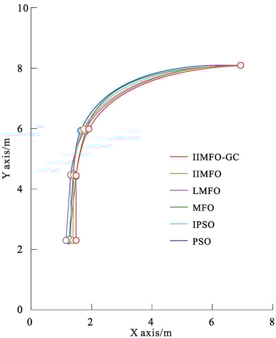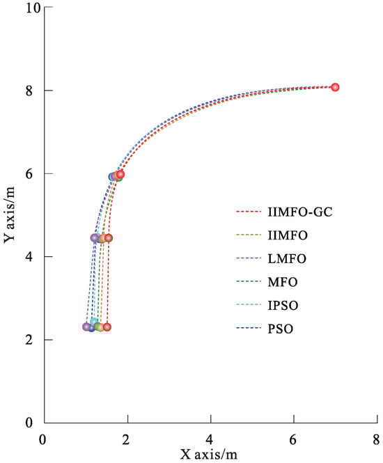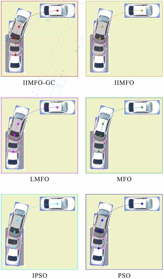 As can be seen from Table 3 and Figure 9, compared with the other five optimization algorithms, the IIMFO-GC proposed in this study exhibits a better reference trajectory; in particular, as shown in Figure 9, the reference trajectory path of IIMFO-GC is shorter. As can be seen from Table 4 and Figure 10, compared with the other five optimization algorithms, based on the same tracking control algorithm (Fuzzy PID), the IIMFO-GC proposed in this study obtains better tracking control results; in particular, as shown in Figure 10, the actual parking path of IIMFO-GC is shorter. As can be seen from Table 5 and Figure 11, compared with the other five optimization algorithms, based on the same tracking control algorithm (Fuzzy PID), the IIMFO-GC proposed in this study obtains tracking control results with fewer errors; in particular, as shown in Figure 11, the error in the tracking control of IIMFO-GC is smaller, and its tracking control trajectory errors for whole ARP process are fewer. Figure 7 shows that compared with the other five optimization algorithms, the IIMFO-GC proposed in this study exhibits a better reference trajectory; moreover, the optimized reference trajectory is closer to the near side line of parking garage and has a smaller expected berth inclination angle. As can be seen from Table 5, compared with the other five optimization algorithms, the IIMFO-GC proposed in this study has a better berthing inclination angle for both optimization and tracking control. Table 6 and Figure 6 and Figure 8 show that compared with the other five optimization algorithms, based on the same tracking control algorithm (Fuzzy PID), the IIMFO-GC proposed in this study obtains a better tracking control path; moreover, the tracking control path is closer to the near side line of the parking garage, and the actual berth inclination angle is smaller. As shown in Table 7, compared with the other five optimization algorithms, the IIMFO-GC proposed in this study is completed in a shorter time.