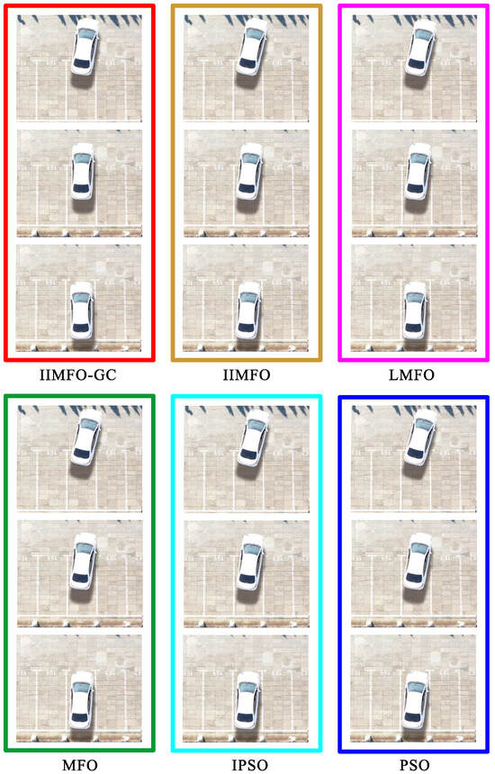 The experimental results for actual reverse parking given in this study include not only the optimization and tracking control results obtained using the parking monitoring host computer, but also the unmanned aerial photography images of several fixed points of the collected vehicle coverage areas during reverse parking. In order to achieve a fair comparison between the six algorithms, the same three fixed points of the collected vehicle coverage areas were selected: parking point followed by m, parking point followed by m, and parking stop point followed by m. The results obtained using the parking monitoring host computer for optimization and tracking control at fixed points of the collected vehicle coverage areas are shown in Figure 6 and Figure 7; the unmanned aerial images of the actual scene at fixed points of the collected vehicle coverage areas are shown in Figure 8; optimization and tracking control curves for the reference trajectories of automatic reverse parking are shown in Figure 9 and Figure 10; and tracking control trajectory error curves of the whole ARP process are shown in Figure 11. The position, path length, and berthing inclination angle results for automatic reverse parking optimization and tracking control are shown in Table 3 and Table 4. The tracking control errors in the position, path length, and berthing inclination angle results are shown in Table 5. The computational costs of each algorithm are shown in Table 6.