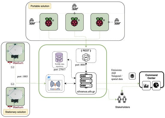Figure 1 demonstrates an overview of the Health Impact Assessment system. This system is built upon three core components: (i) a portable and a (ii) stationary solution dedicated to monitoring air quality, particularly in the context of individuals exposed to a wildfire incident, alongside (iii) a web application managing the data flow from these solutions. The first component targets equipping frontline first-responders, particularly firefighters, with a compact node housing a Raspberry Pi, five emission sensors, and a communication unit. Data from these nodes are seamlessly transmitted and recorded in a MONGODB (https://www.mongodb.com/, accessed on 3 March 2024) database through PUT requests directed at specific endpoints. The second component, the stationary solution, comprises a set of Libelium Smart Spot models strategically positioned in safe areas near the wildfire incident. These devices are well suited for monitoring various environmental factors such as air quality, temperature, and humidity. Data from these devices are transferred via an (Message Queuing Telemetry Transport) MQTT (https://mqtt.org/, accessed on 3 March 2024) broker to interested parties. Finally, the web application acts as the third component, receiving and storing observations from both systems into a repository. Command centers and stakeholders interested in air quality and its impact on health can easily access the latest emission data, AQI and spatiotemporal information through straightforward GET requests to designated endpoints. Access to these resources requires authentication using credentials for effective utilization by our partners.