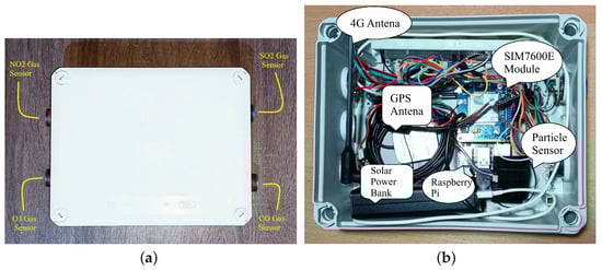 Complete portable air quality observation system. (a) Assembled node. (b) Interior System and Components.