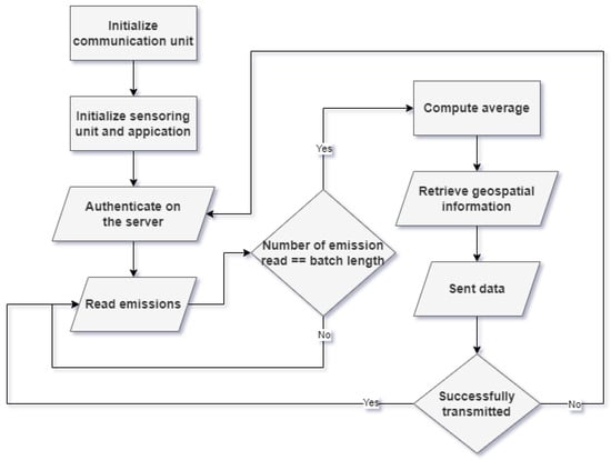 The main algorithm that the Raspberry Pi implements is shown in Figure 4. The communication unit initialization is performed with the help of an external command line application, the ModemManager, for enabling the modem for communication, and another application, udhcp for providing a dynamic IP. The emissions that are read from the sensors are temporarily stored in a buffer as a batch. When the buffer has reached a specified amount of records, then the average of the batch is sent to the server. Additionally, geospatial information as well as the unique identifier of the node are attached. The geospatial information is provided by the connection unit. The authentication is performed using unique credentials for each node. The credentials consist of a unique username and a password. Authentication is required since the endpoint communication is performed with a JSON Web Token (JWT) (more details are provided later).
