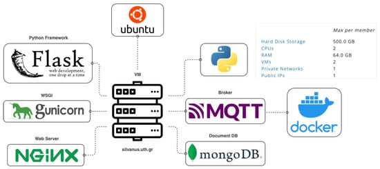 The continuous operation and seamless request handling of the web application require the utilization of a dedicated web server. Our web server consists of two (2) software solutions, i.e., Gunicorn (https://gunicorn.org/, 4 March 2024) and Nginx (https://www.nginx.com/, accessed on 3 March 2024). The Gunicorn server provides the Python Web Server Gateway Interface (WSGI) established to allow different Python web applications to communicate with the web server program. Typically, a web server program communicates with a backend application using an interface. For back-end applications written in Python, the standard interface for the servers is WSGI. Gunicorn eliminates the need for additional configurations. However, Gunicorn’s limitations in handling network congestion, load balancing, and scalability highlight the necessity for a supplementary solution. For this reason, the Nginx server is implemented to enhance the application’s scalability and tackle security concerns. Figure 7 presents the server’s setup, i.e., the specifications and the integrated software components.