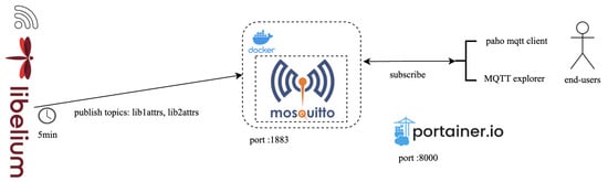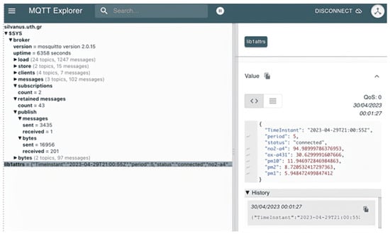 MQTT broker deployment and exploitation is presented in Figure 8. Initially, we set up a Mosquitto MQTT broker within a Docker container hosted on our virtual machine. Subsequently, we configured each equipment to publish data at five-minute intervals to two specified topics, respectively (lib1attrs and lib2attrs). For end-users/stakeholders who possess an interest in health impact, subscription to our broker is achievable through MQTT clients such as MQTT Explorer or the Paho (https://pypi.org/project/paho-mqtt/, accessed on 3 March 2024) package in Python. Portainer.io is also installed on our VM as a container management tool. The operational procedure of the MQTT Explorer (https://mqtt-explorer.com/, accessed on 3 March 2024) client is illustrated in Figure 9. In this instance, a client is successfully subscribed to the topic “lib1attrs”, and at regular 5 min intervals, it receives a JSON file as depicted in Listing 3.